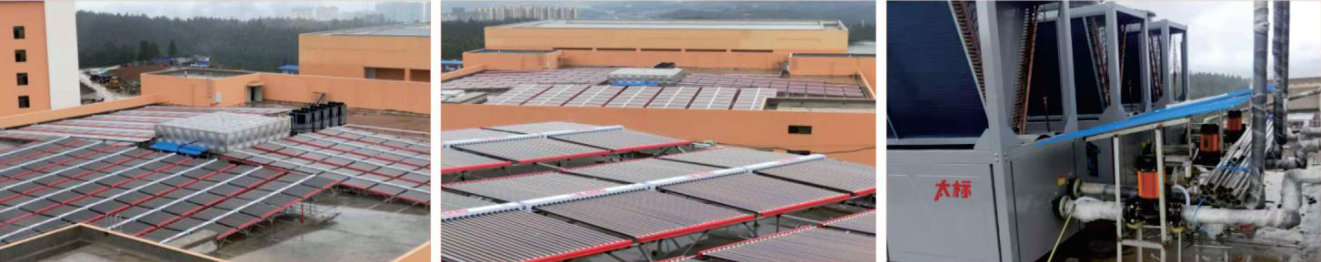 系統(tǒng)概述:安裝真空管集熱器33800管,集熱面積4394㎡,系統(tǒng)配置共計(jì)800匹空氣源熱泵輔助系統(tǒng)運(yùn)行